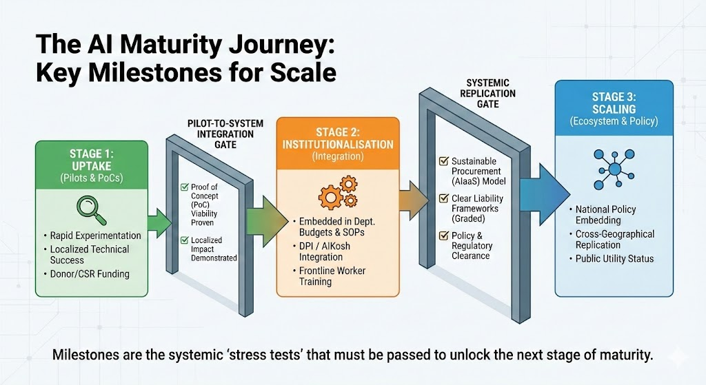 Scaling AI in development involves key milestones from initial Uptake (Proof-of-Concept, Pilots, Demonstrating Value), moving to Institutionalisation (Integration, Policy, Governance, Capacity Building), and finally reaching Scale (Widespread Adoption, Ecosystem Building, Sustainable Impact).