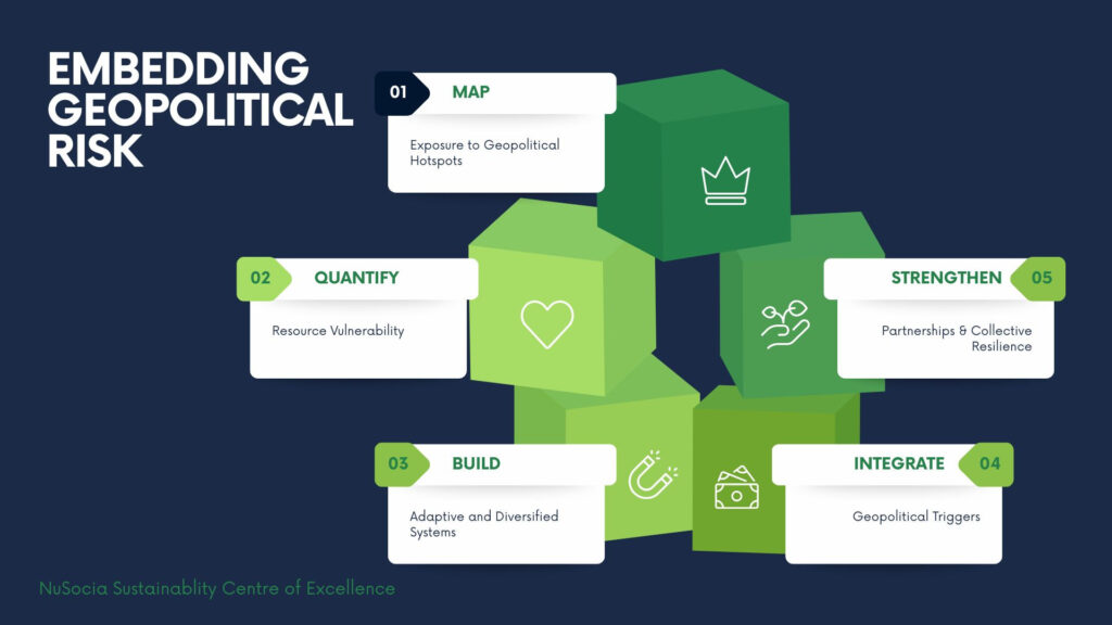 In order to incorporate this risk within corporate sustainability strategy, the NuSocia Sustainability Centre of Excellence highlights 5 pillars for businesses to build against geopolitical risk.